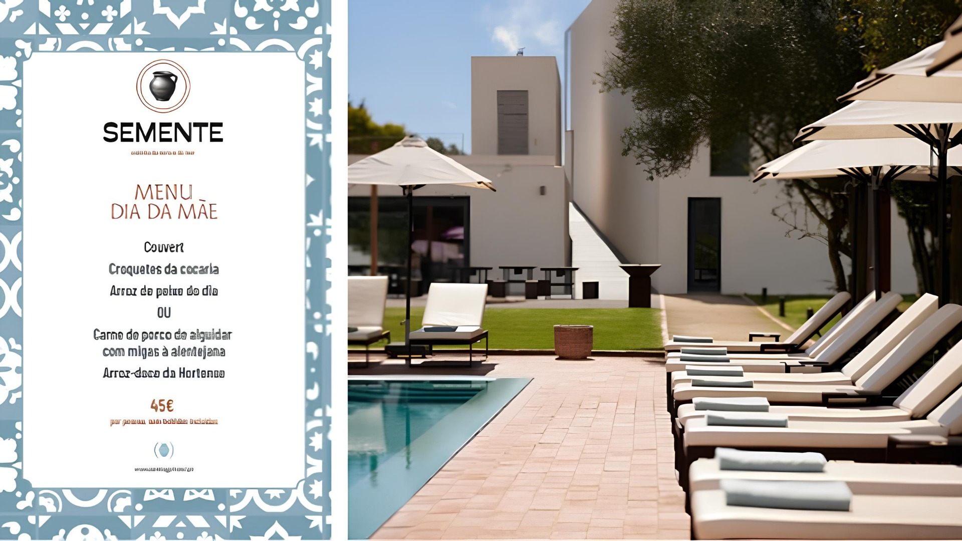 Almoço especial no restaurante Semente, entre as 12h30 e as 15h00, com menu dedicado à ocasião e acesso à piscina durante todo o dia.