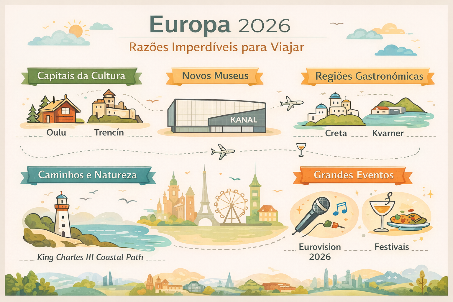 Resumindo: 2026 traz uma combinação única de arte, cultura, gastronomia e experiências novas — desde Capitais Europeias da Cultura a rotas naturais e festivais de comida e música — oferecendo muitos motivos para visitar (ou revisitar) o velho continente.