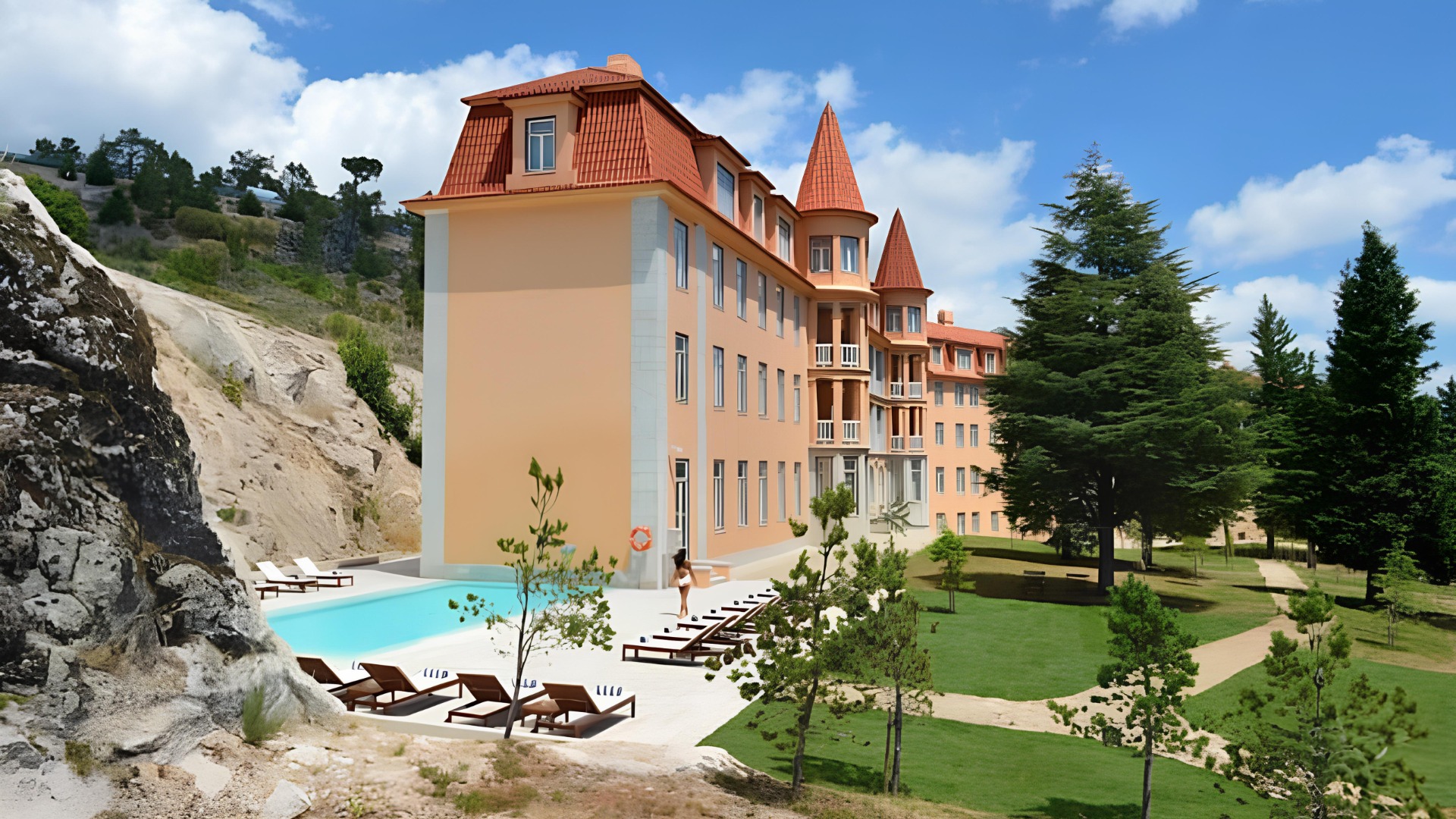 Hotel de 5 estrelas rodeado pela natureza, com piscinas interior e exterior, spa, áreas de lazer para crianças, restaurantes e vistas sobre a serra, ideal para famílias e para quem procura relaxar perto dos principais monumentos de Sintra.