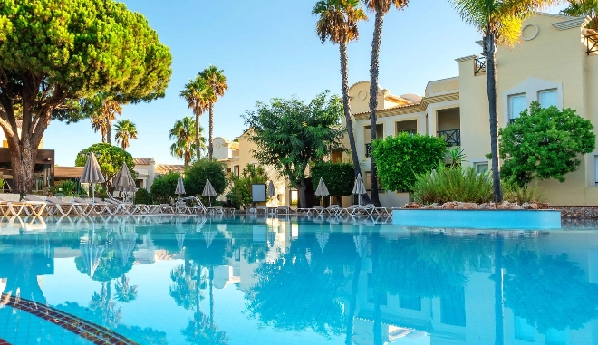 Resort de 4 estrelas com regime Tudo Incluído situado em Albufeira, com acesso direto à Praia da Falésia e rodeado por jardins naturais e piscinas exteriores, ideal para férias em família ou em casal. Oferece atividades desportivas e de lazer (ténis, minigolfe, voleibol, futebol).